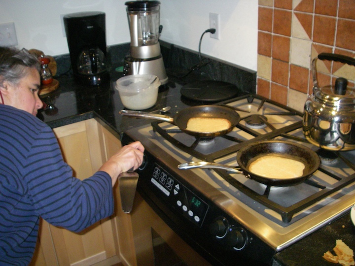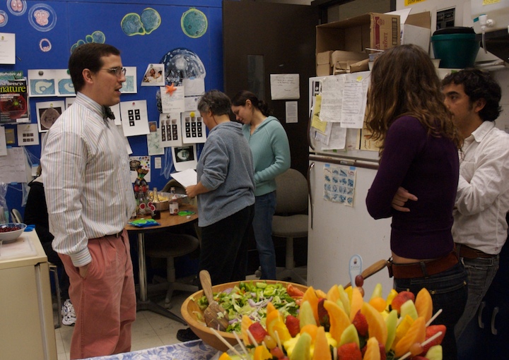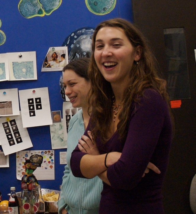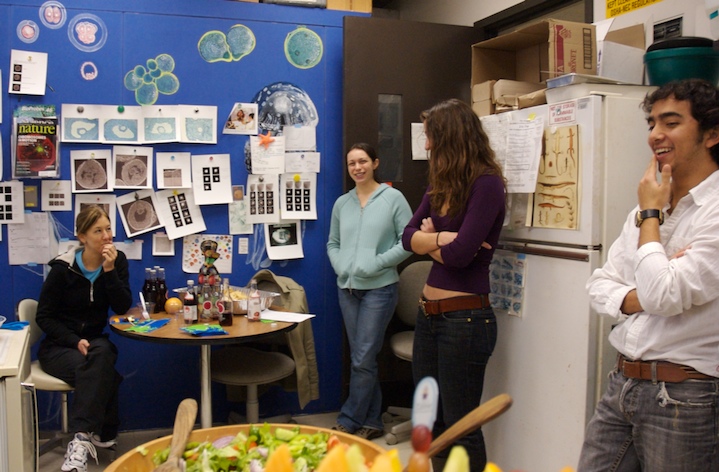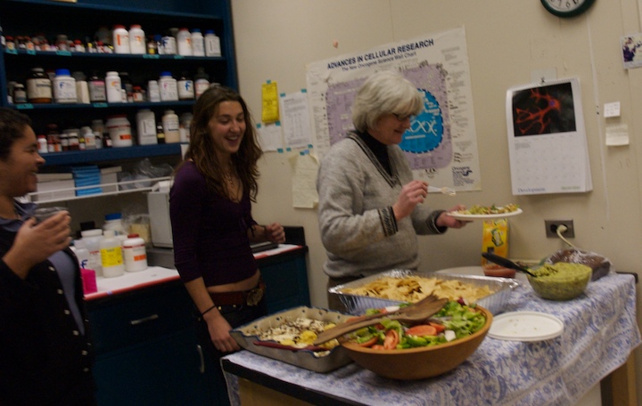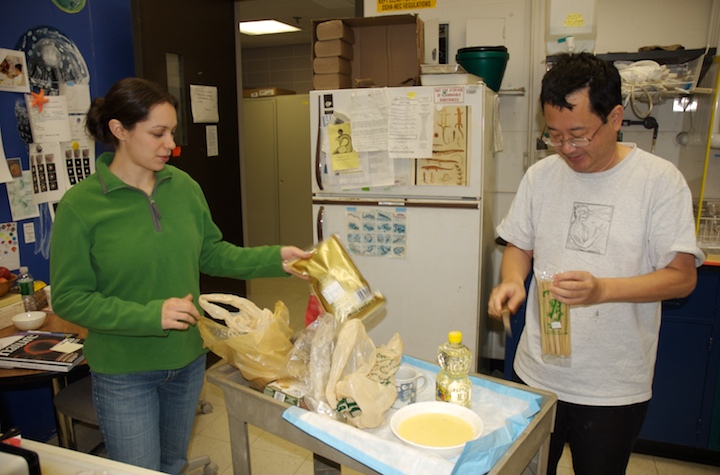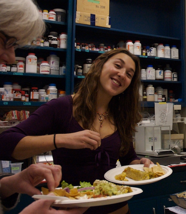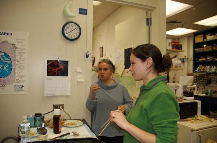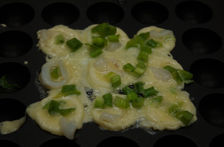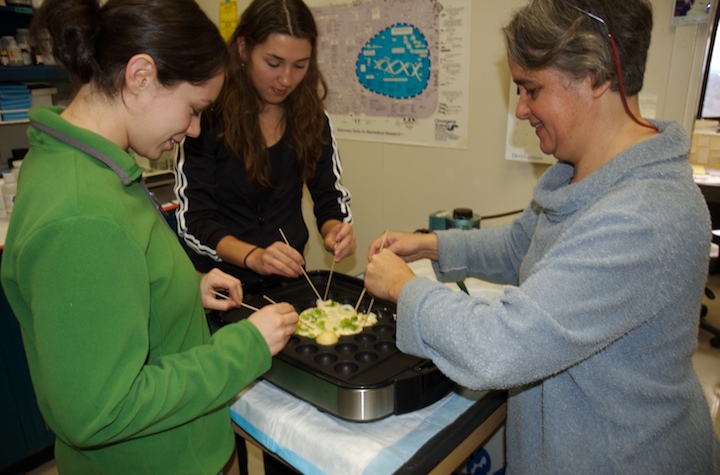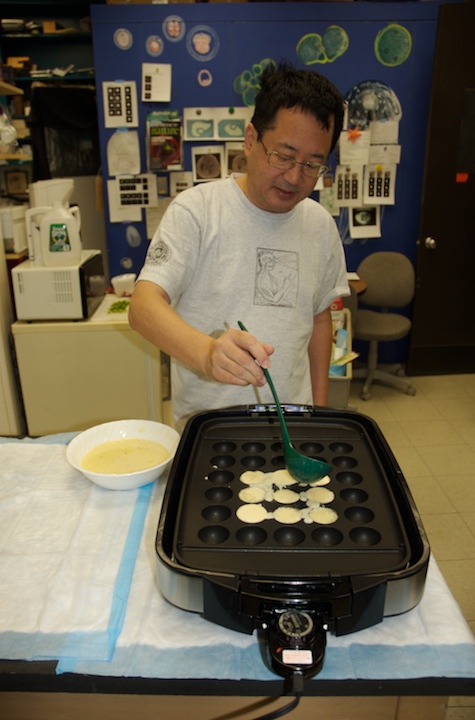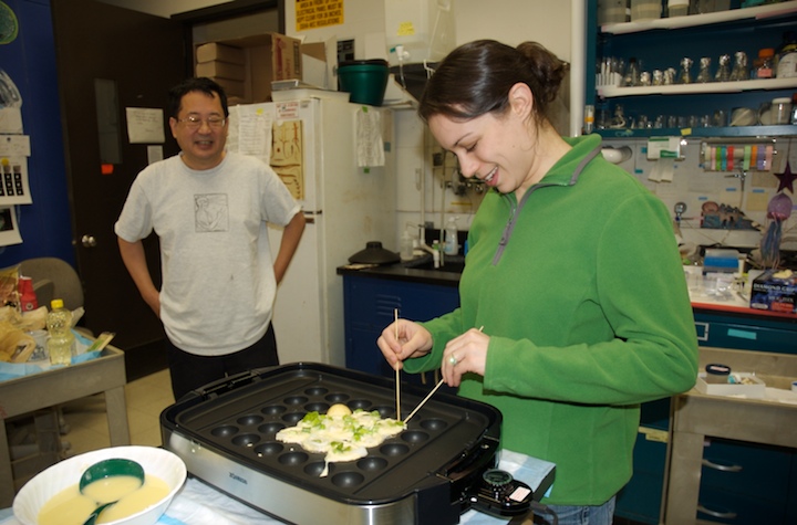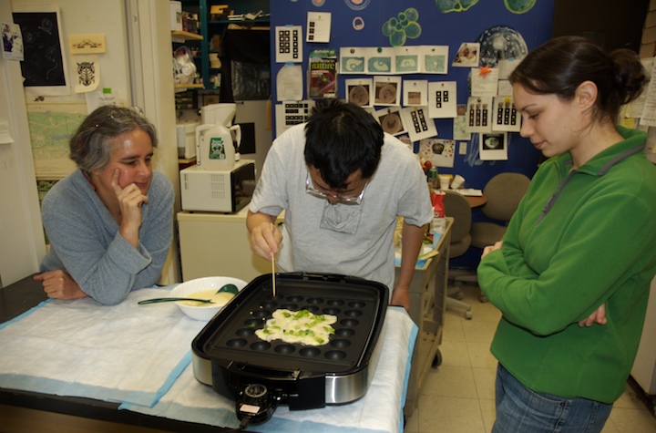 December 12 - takoyaki at the lab - preparation - pour - does it look right? - close up - rachael tries sticks - everyone tries it - it's working! - some almost finished, second batch - rindy has just eaten one.