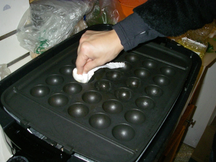 Heat the takoyaki plate; put some oil in one of the holes and use a paper towel