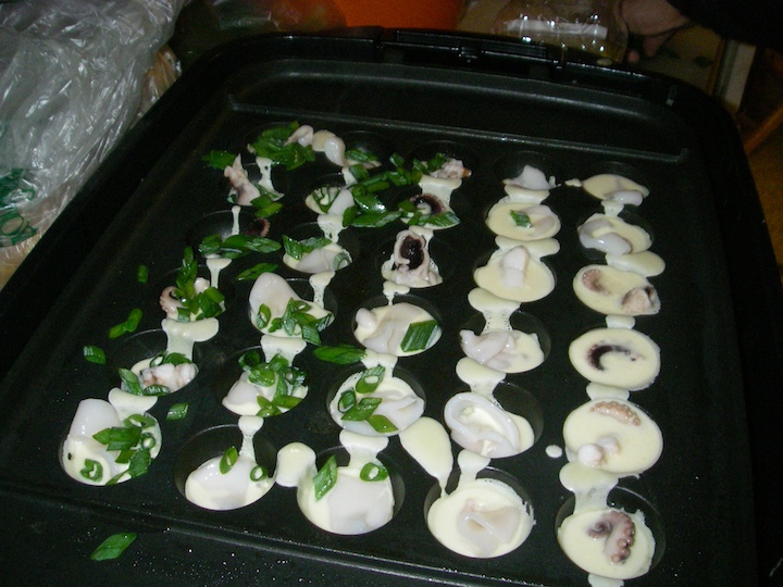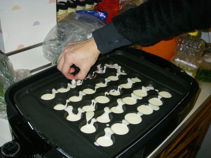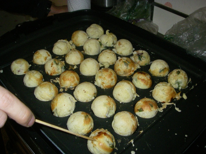 Not shown - as it cooks, turn the takoyaki in the hole several times so that