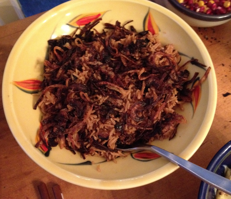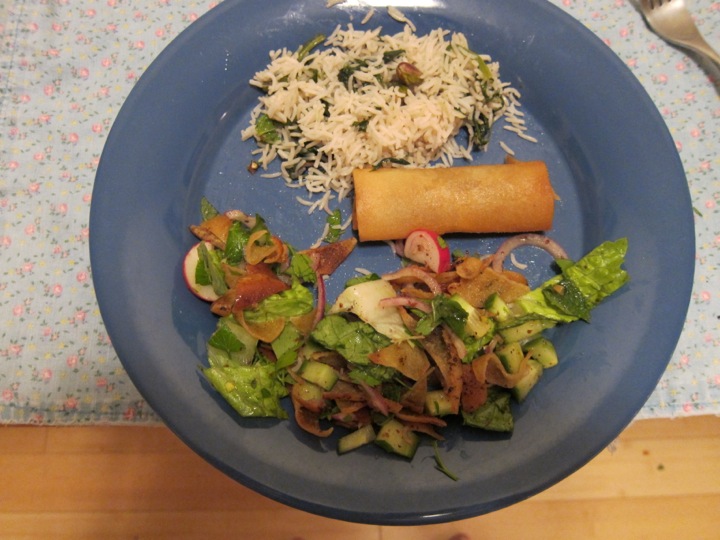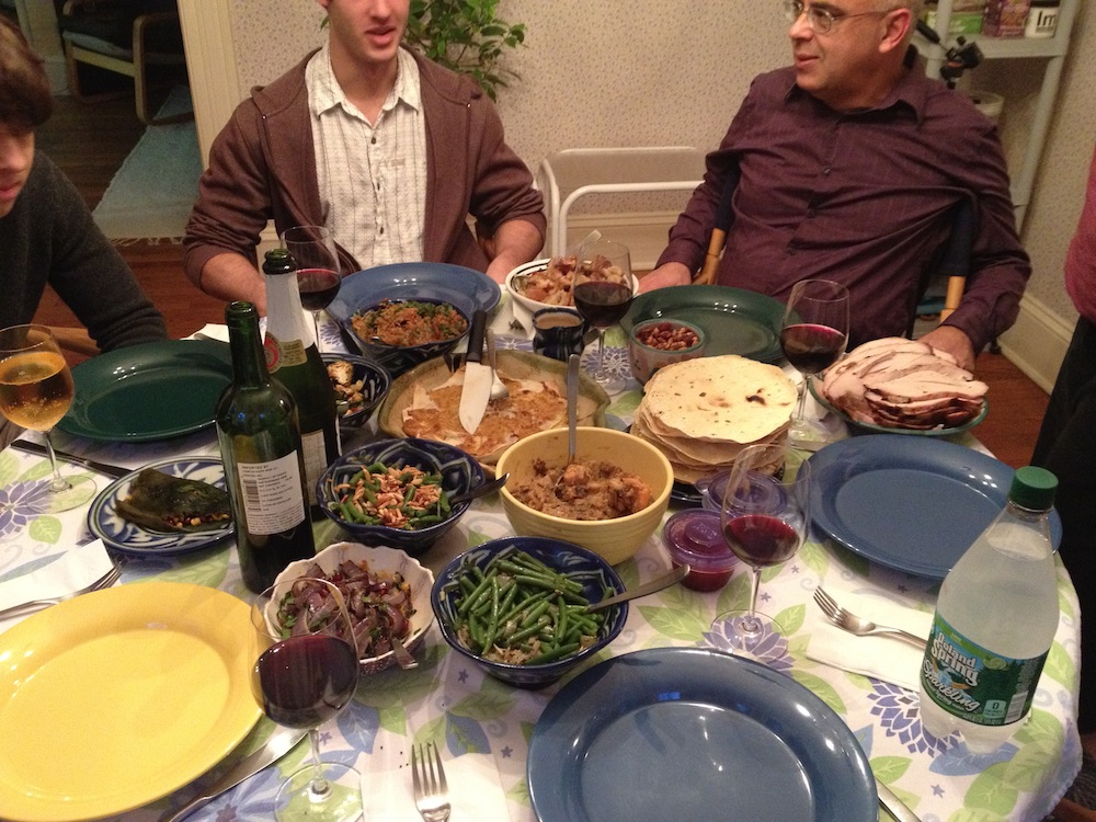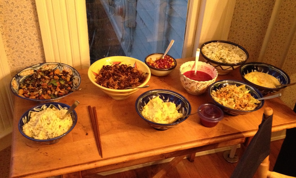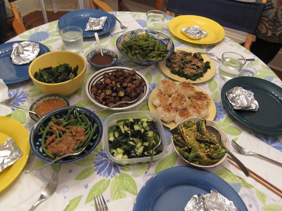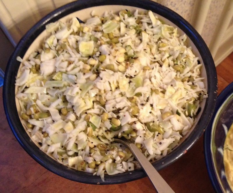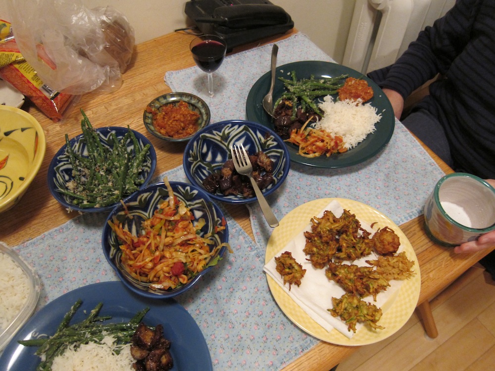 February 12 - indian dinner, sweet sour eggplant, green beans thoren, cabbage with peanuts, zucchini kofte