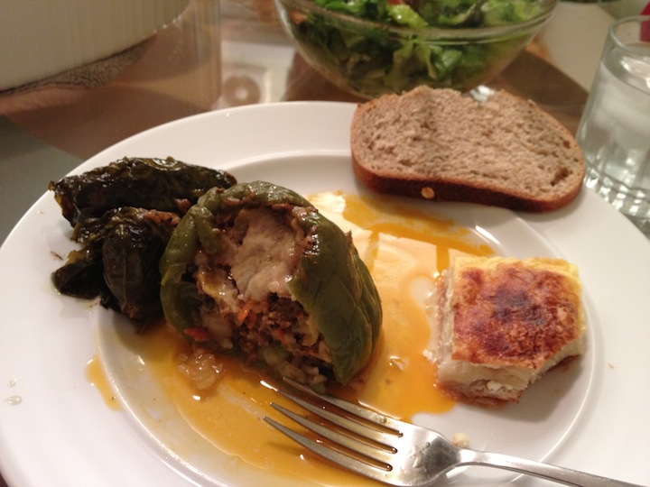 Nov 14 - a visit to St Louis - John H - John & Tanya - banitsa (right), pulneni piperki (center) i rosovi sarmi (left)!