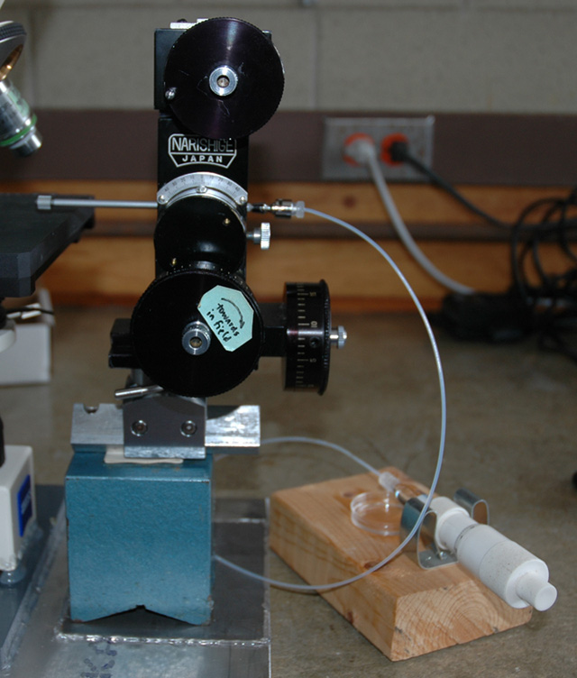 Injections being done with a 10x 0.3 NA objective on an upright