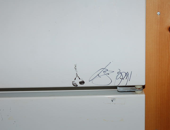 Finally - Michelle Schlief signs the refrigerator (though it's upside down)
