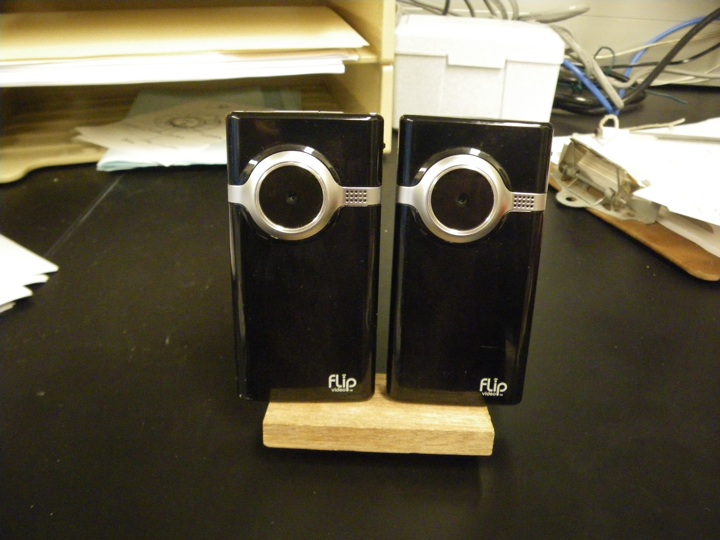 A pair of Flip Mino cameras were mounted side by side on a small piece of wood