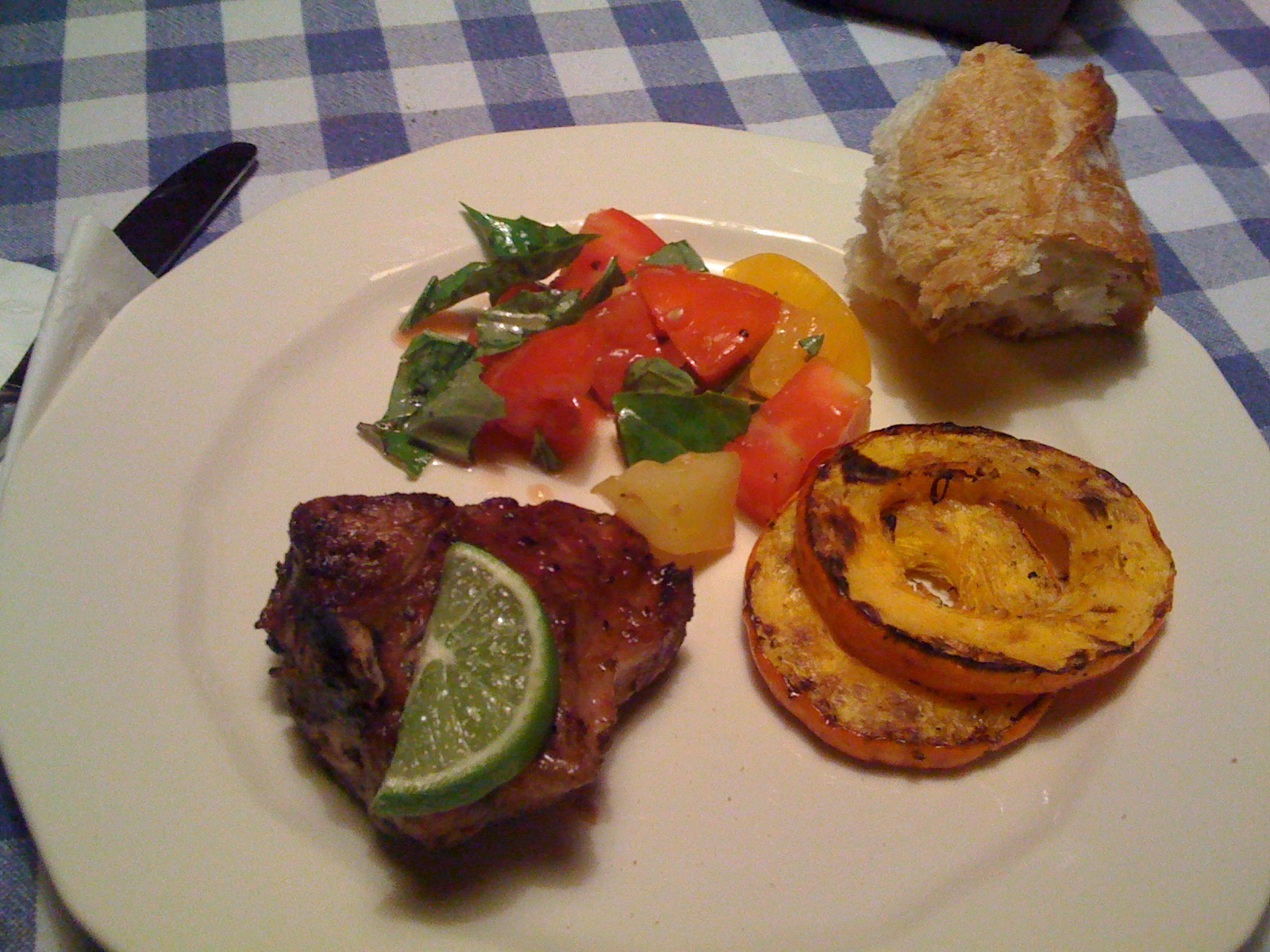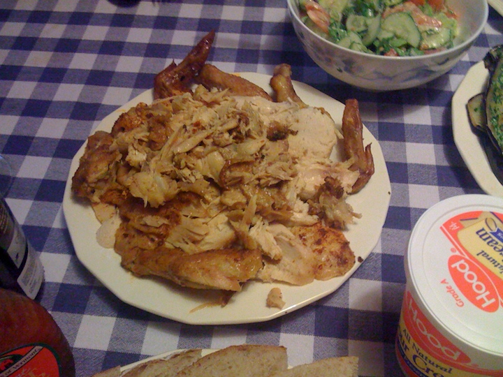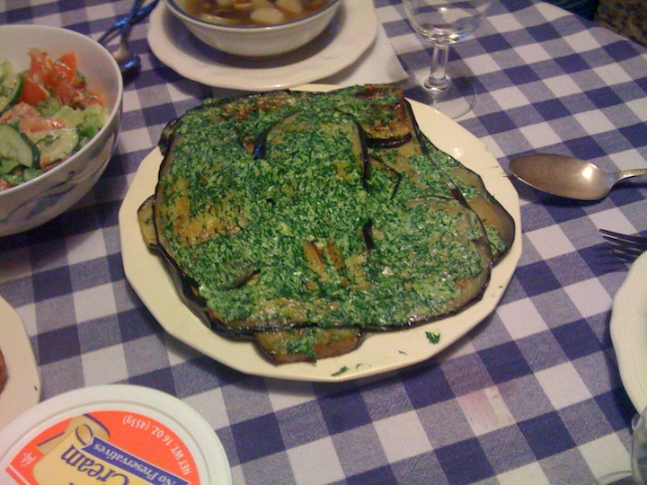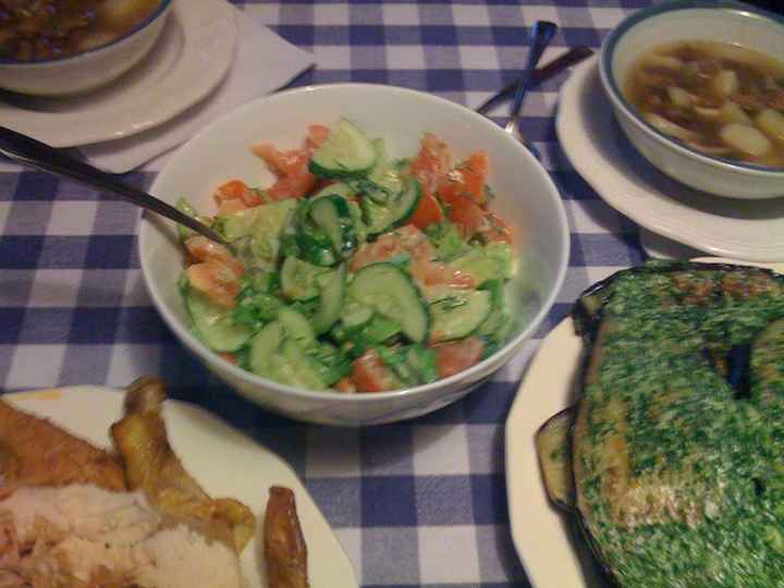 June 27 - another dinner - chicken parts soup(!) - drunken chicken - eggplant / dill sauce - salad