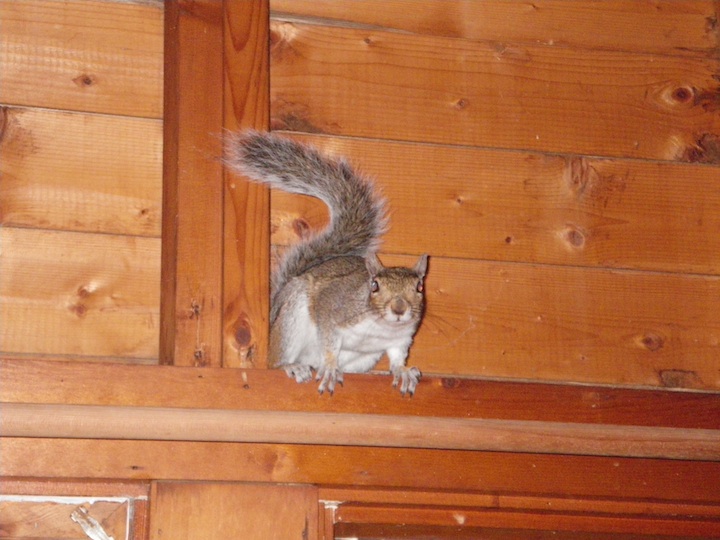 A squirrel in the house - running around - trying