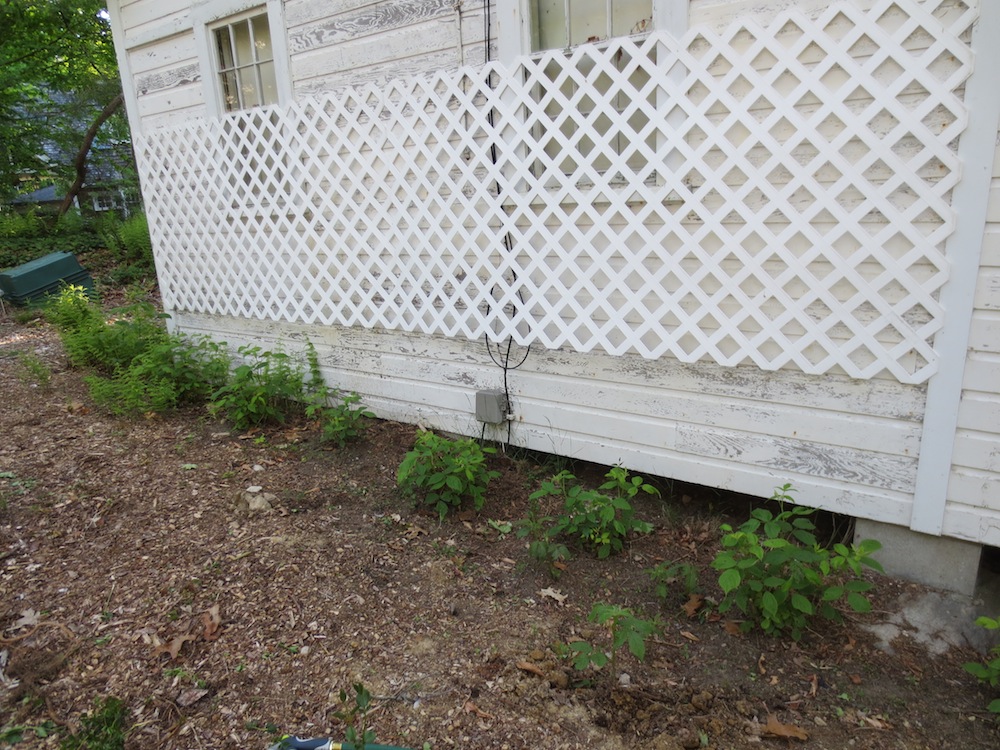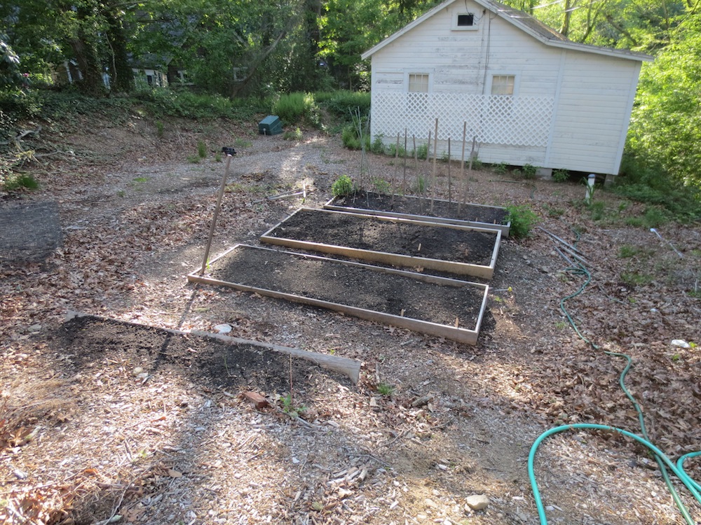 May 27 - the garden - raspberry bushes and trellis, thanks to Sid