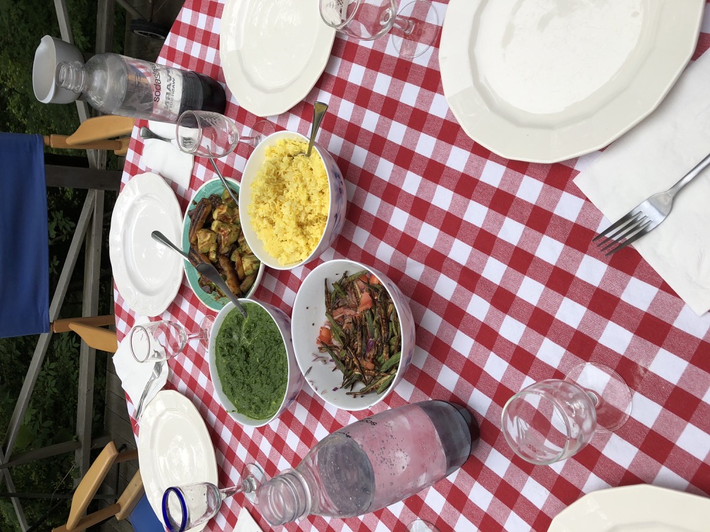 an indian dinner: avocado & bananas, spinach, orange pulao, fried okra