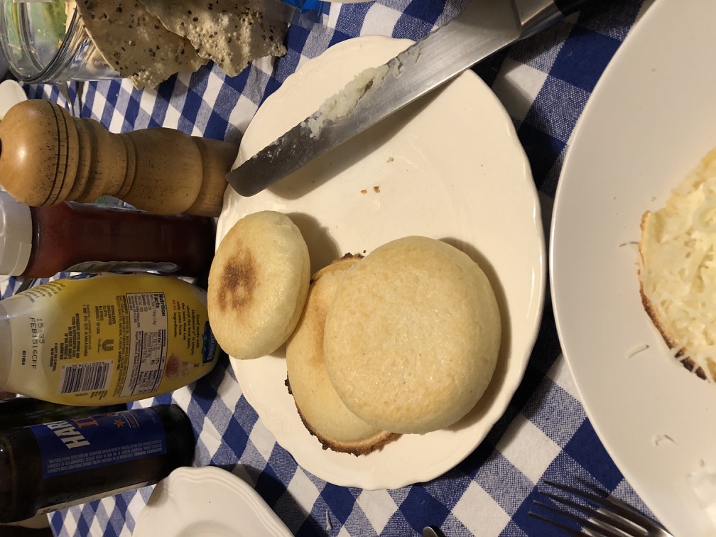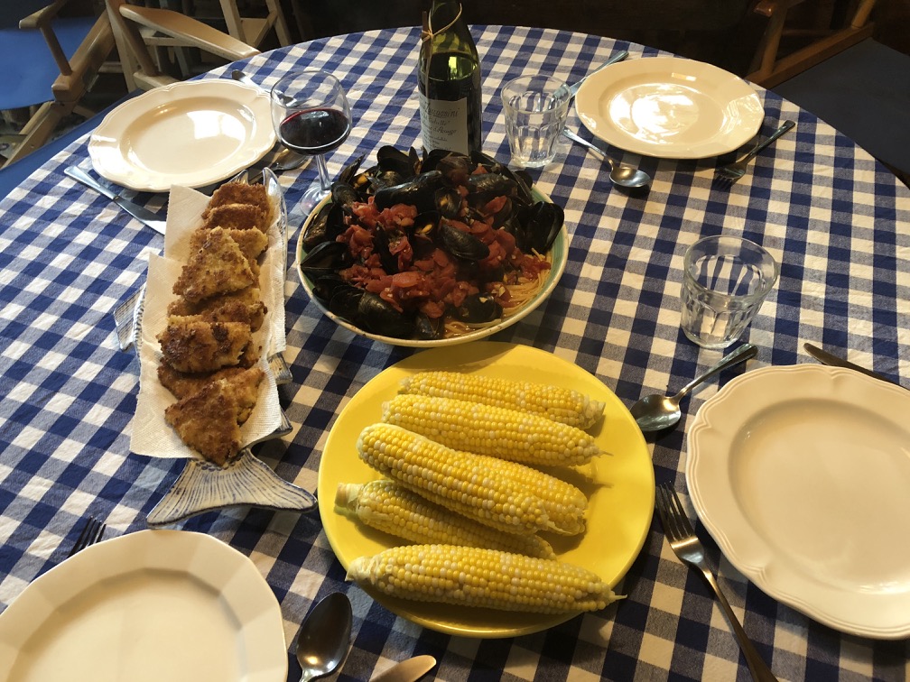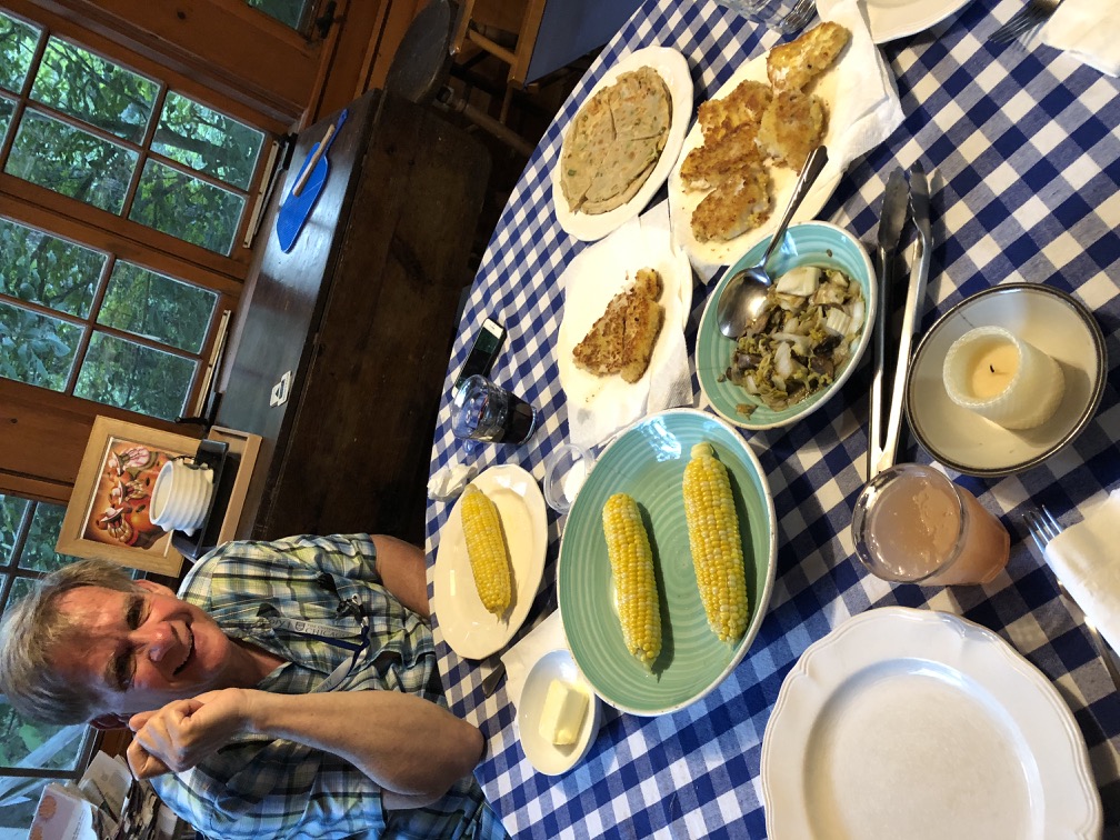 June 30 - last night dinner John / Xufeng: fried fish, corn, scallion pancakes, cabbage & mushrooms