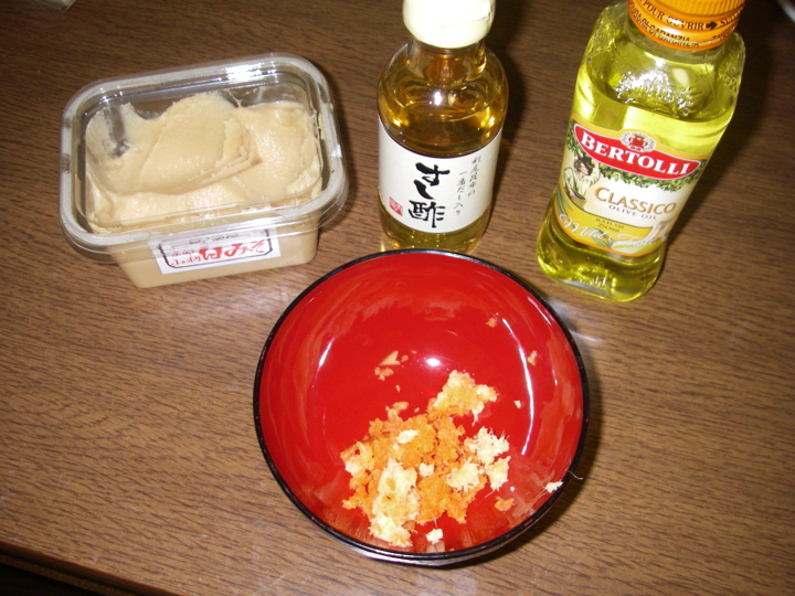 miso, rice wine vinegar, olive oil - mix - put