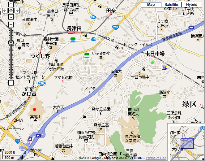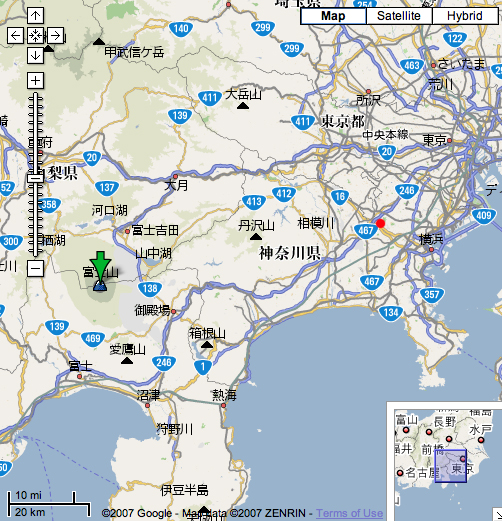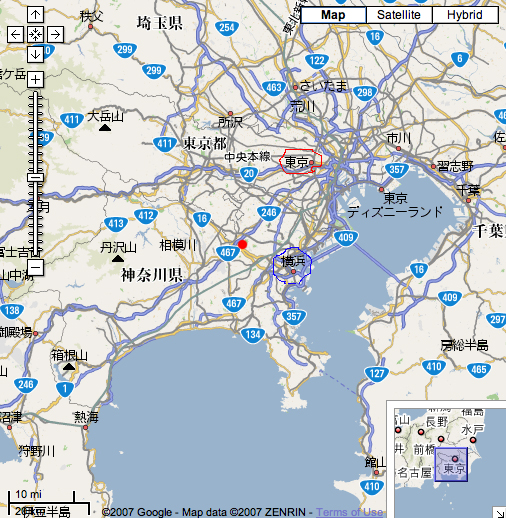 map - red dot in relation to Tokyo (circled in red) and Yokohama (circled in